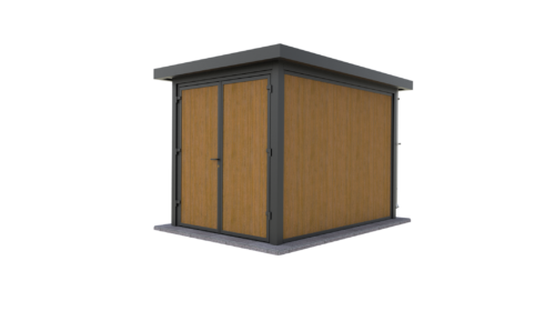 Elke Modesto is opgebouwd uit een robuust gecoat stalen frame (RAL 9004) met wandpanelen naar keuze: duurzaam bamboe of kunststof met houtnerfstructuur in verschillende kleurtinten. Volledig afsluitbaar, weerbestendig en ontworpen voor jarenlang intensief gebruik zonder onderhoud.
