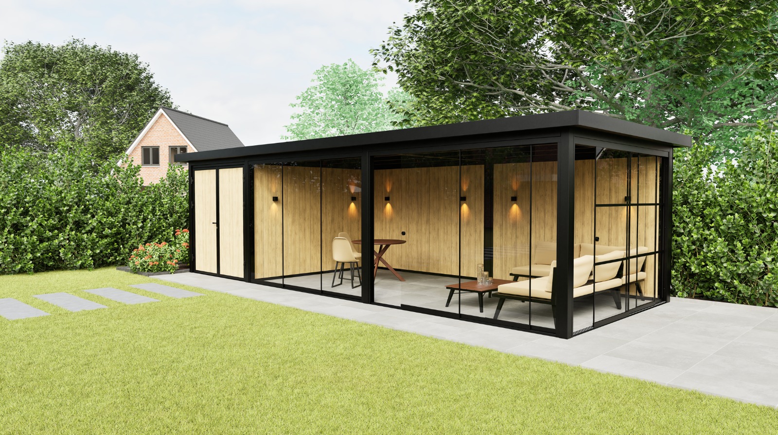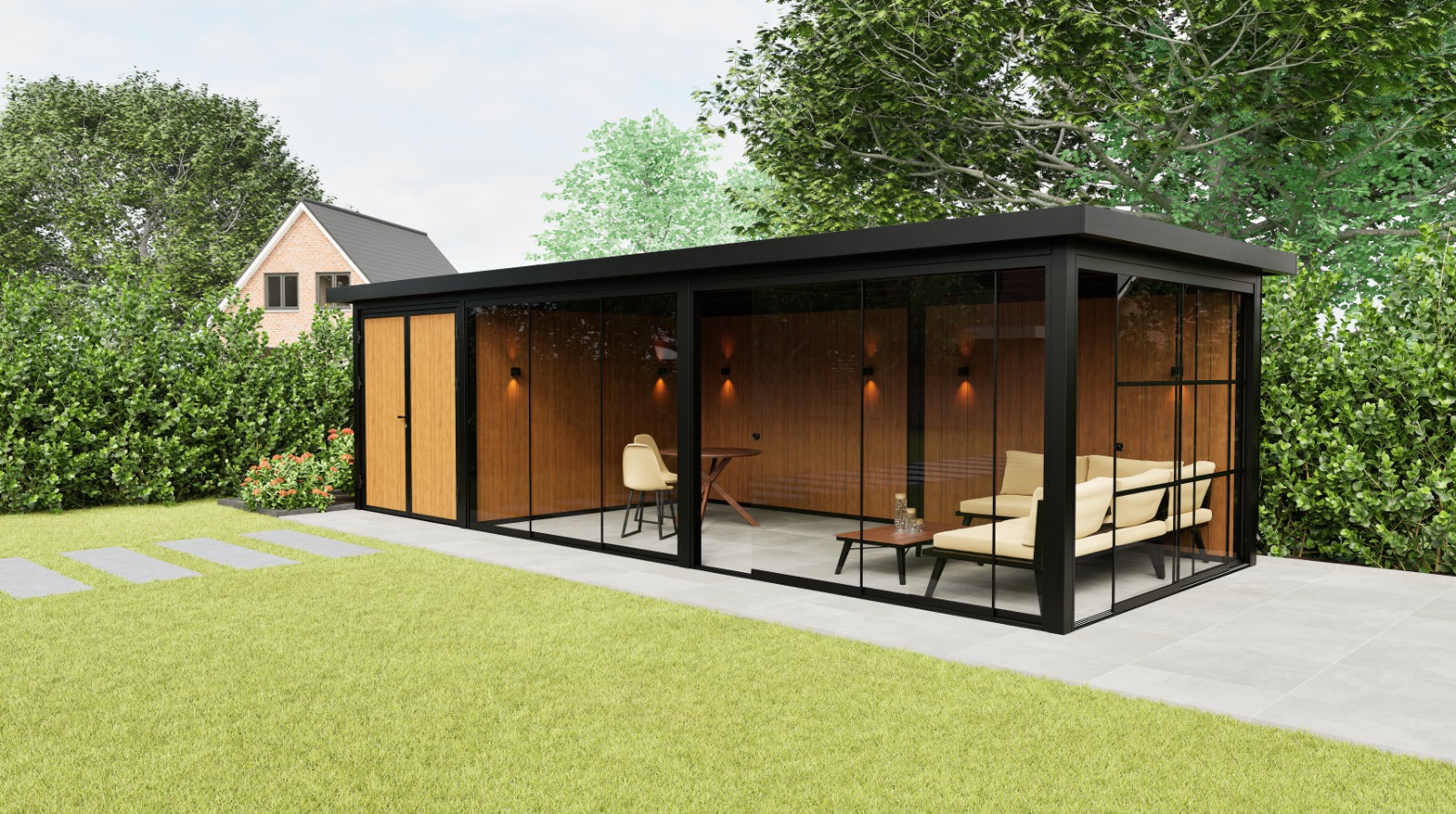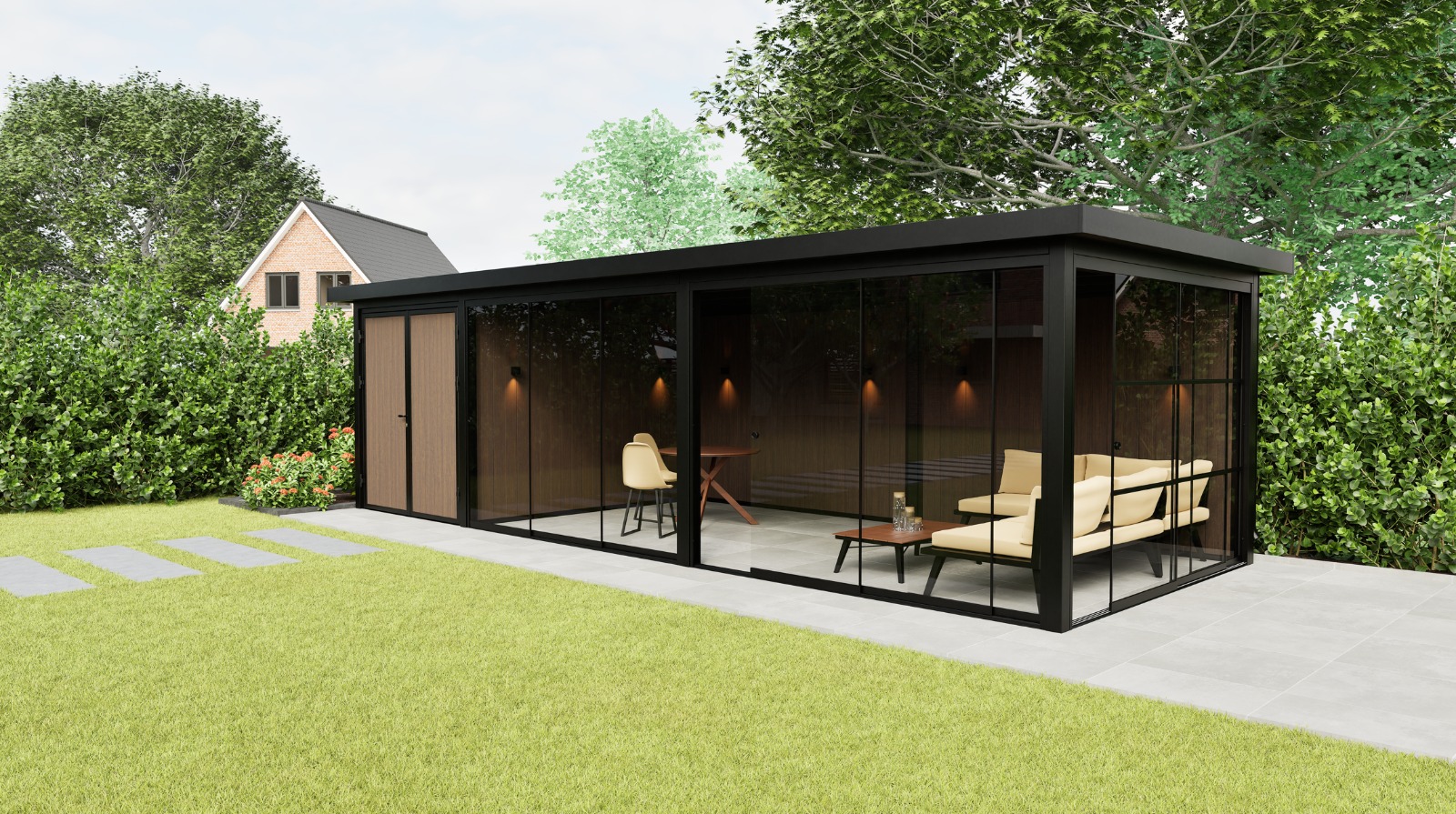 De Panorama Prestige is standaard uitgerust met drie hoogwaardige glasschuifwanden: één Industrial schuifwand voor een krachtig, industrieel accent en twee Frameless schuifwanden voor maximale transparantie en een onbelemmerd uitzicht. Deze combinatie zorgt voor een harmonieuze balans tussen ruimtelijkheid, privacy en karakter. De royale glaspartijen laten veel daglicht binnen en creëren een open verbinding met de tuin, terwijl u toch beschut en comfortabel zit – in elk seizoen.