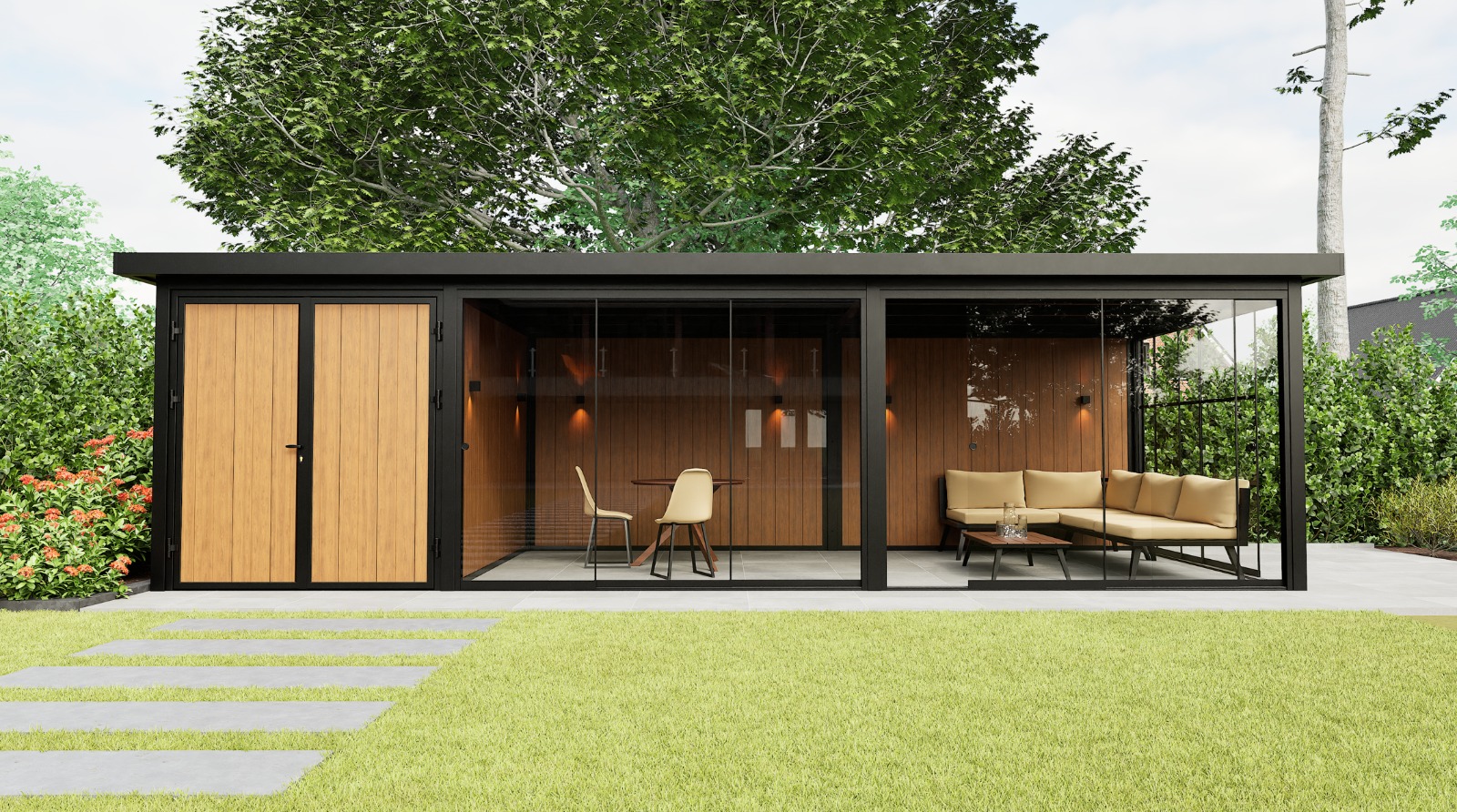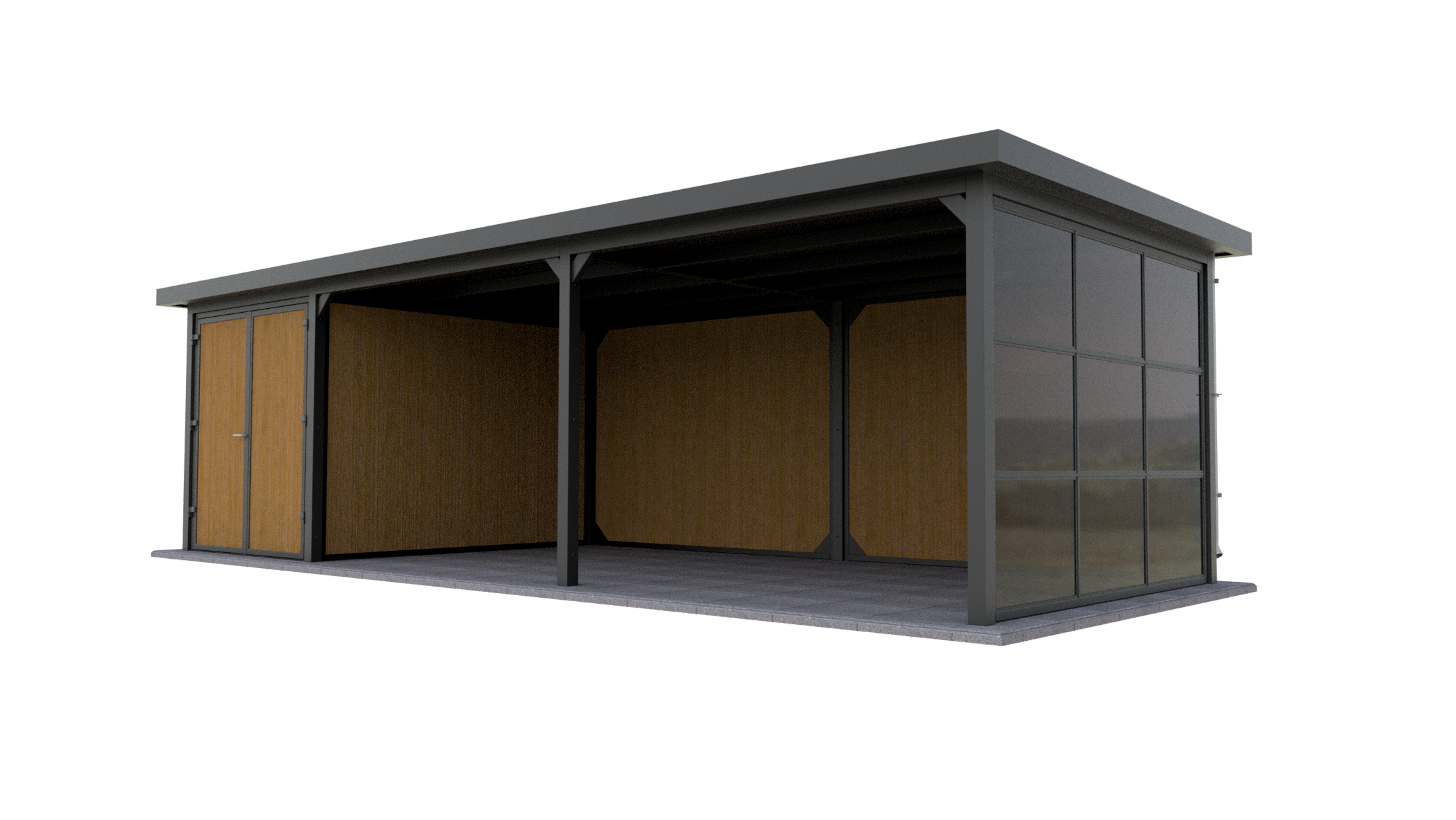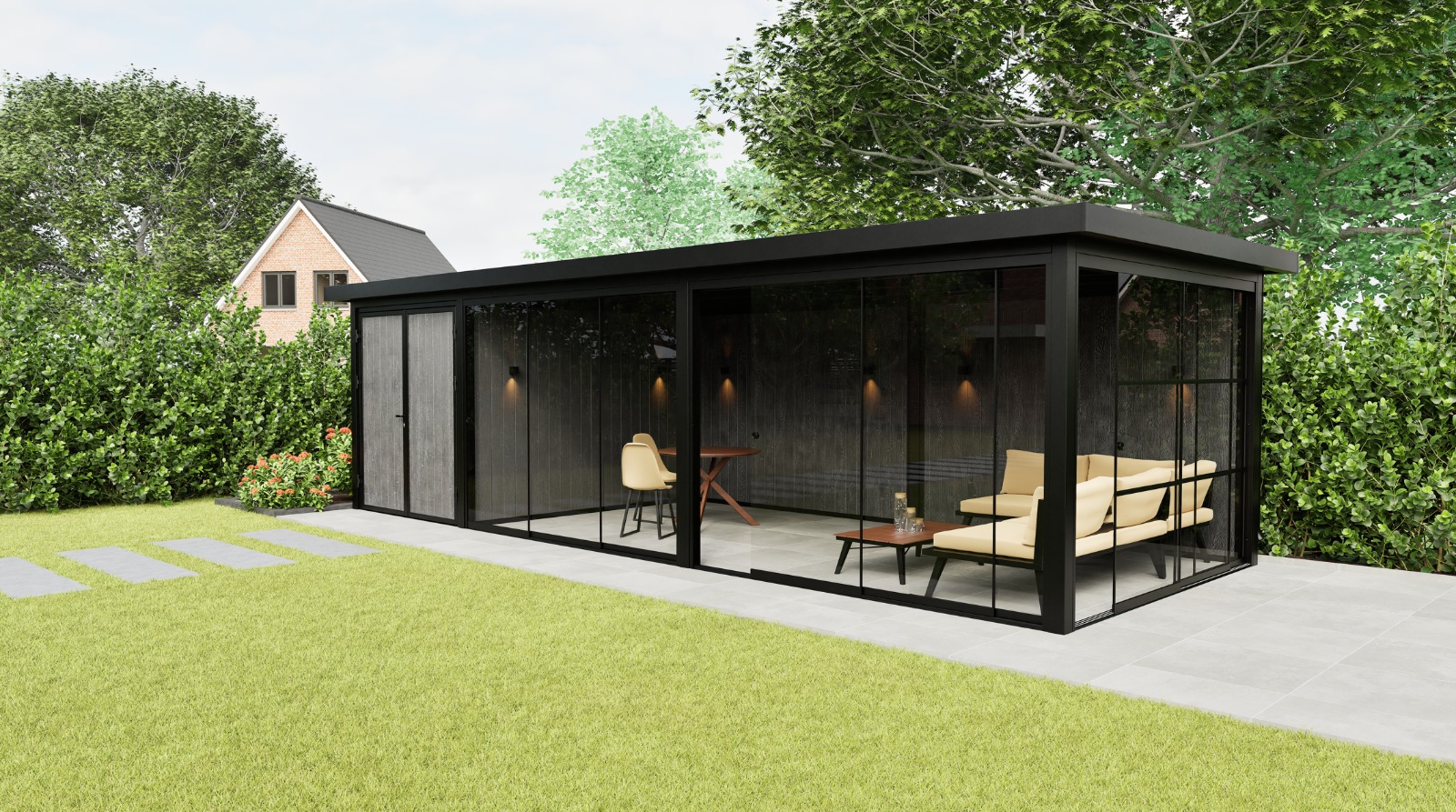 De Panorama Prestige is standaard uitgerust met drie hoogwaardige glasschuifwanden: één Industrial schuifwand voor een krachtig, industrieel accent en twee Frameless schuifwanden voor maximale transparantie en een onbelemmerd uitzicht. Deze combinatie zorgt voor een harmonieuze balans tussen ruimtelijkheid, privacy en karakter. De royale glaspartijen laten veel daglicht binnen en creëren een open verbinding met de tuin, terwijl u toch beschut en comfortabel zit – in elk seizoen.