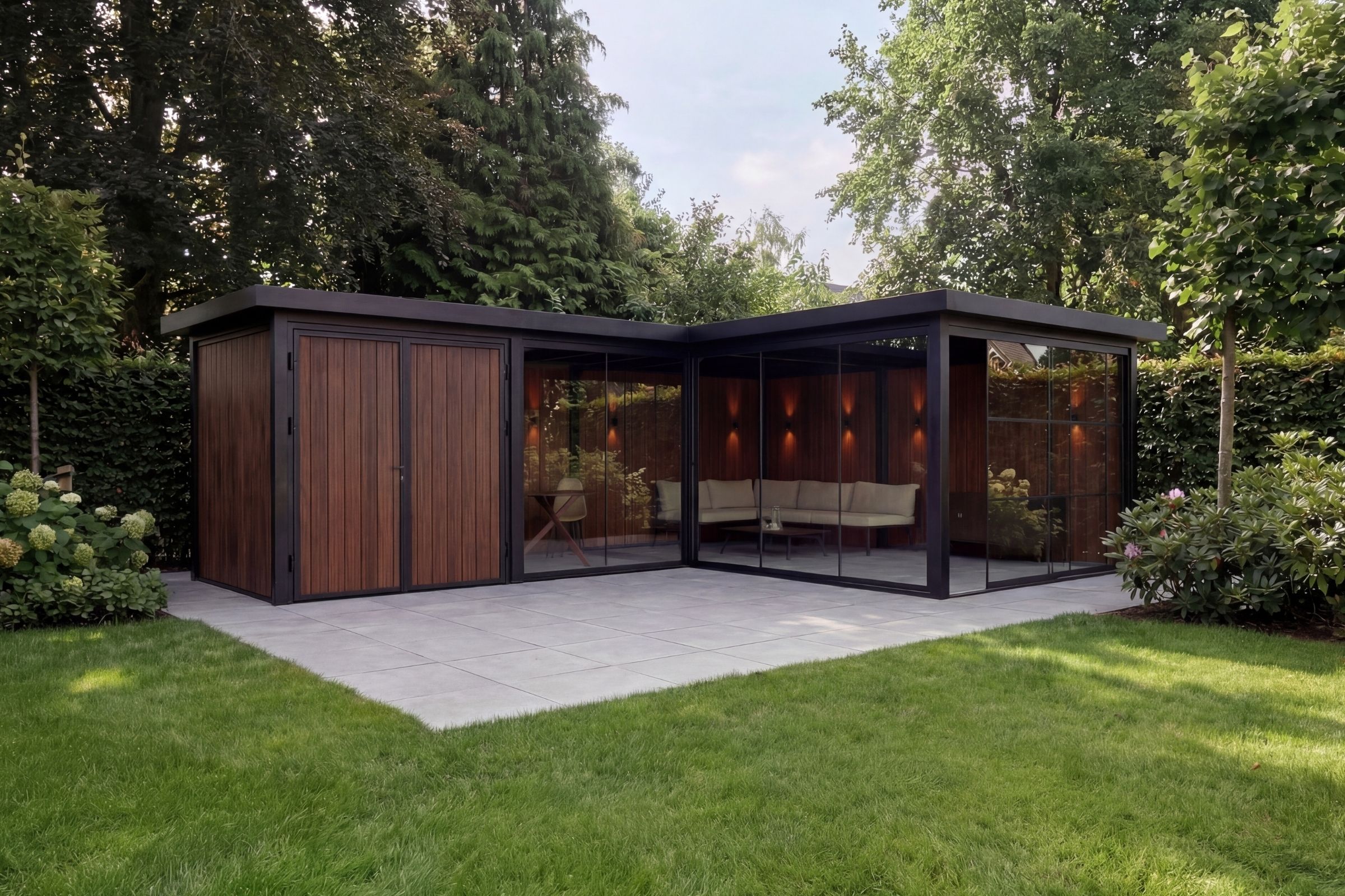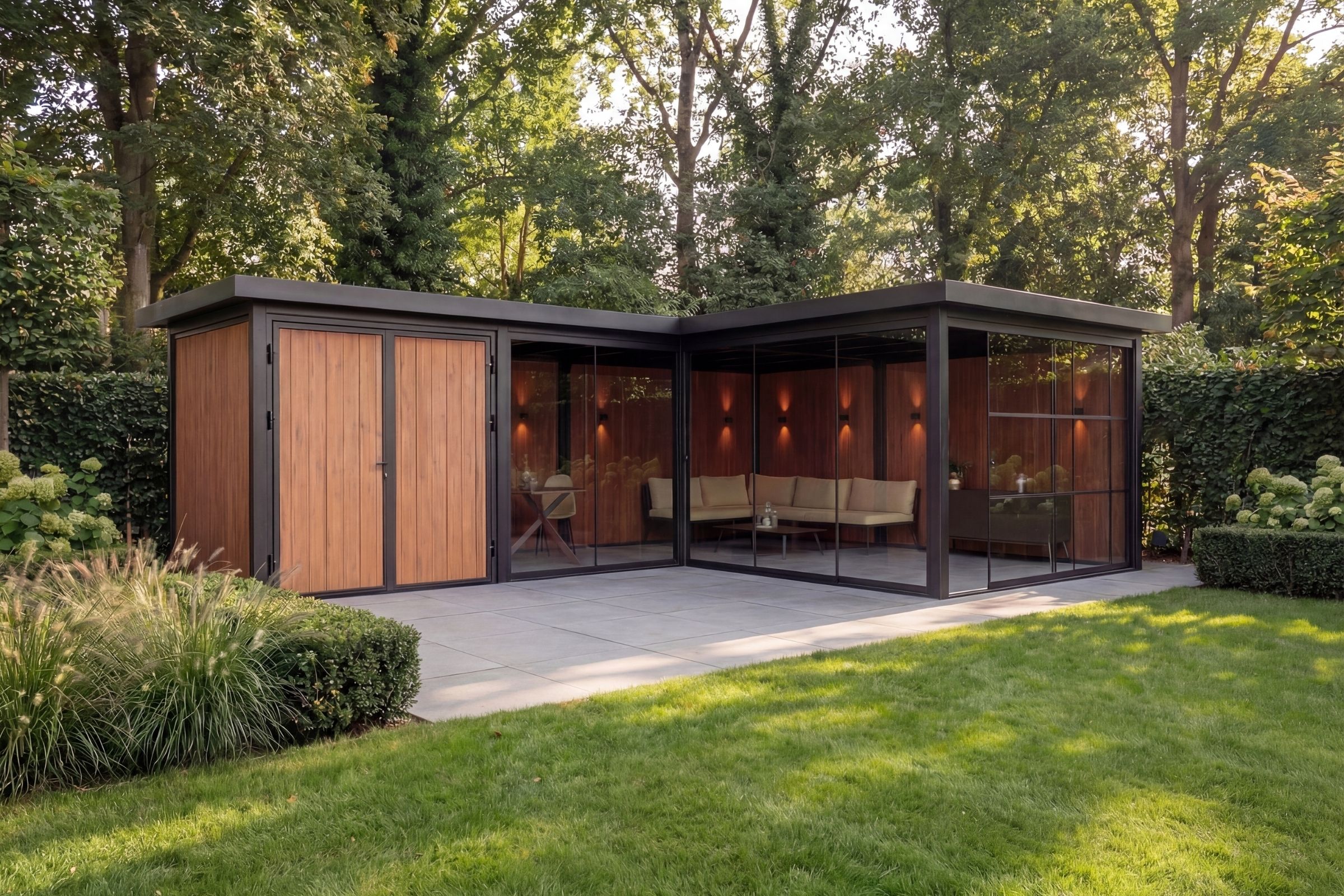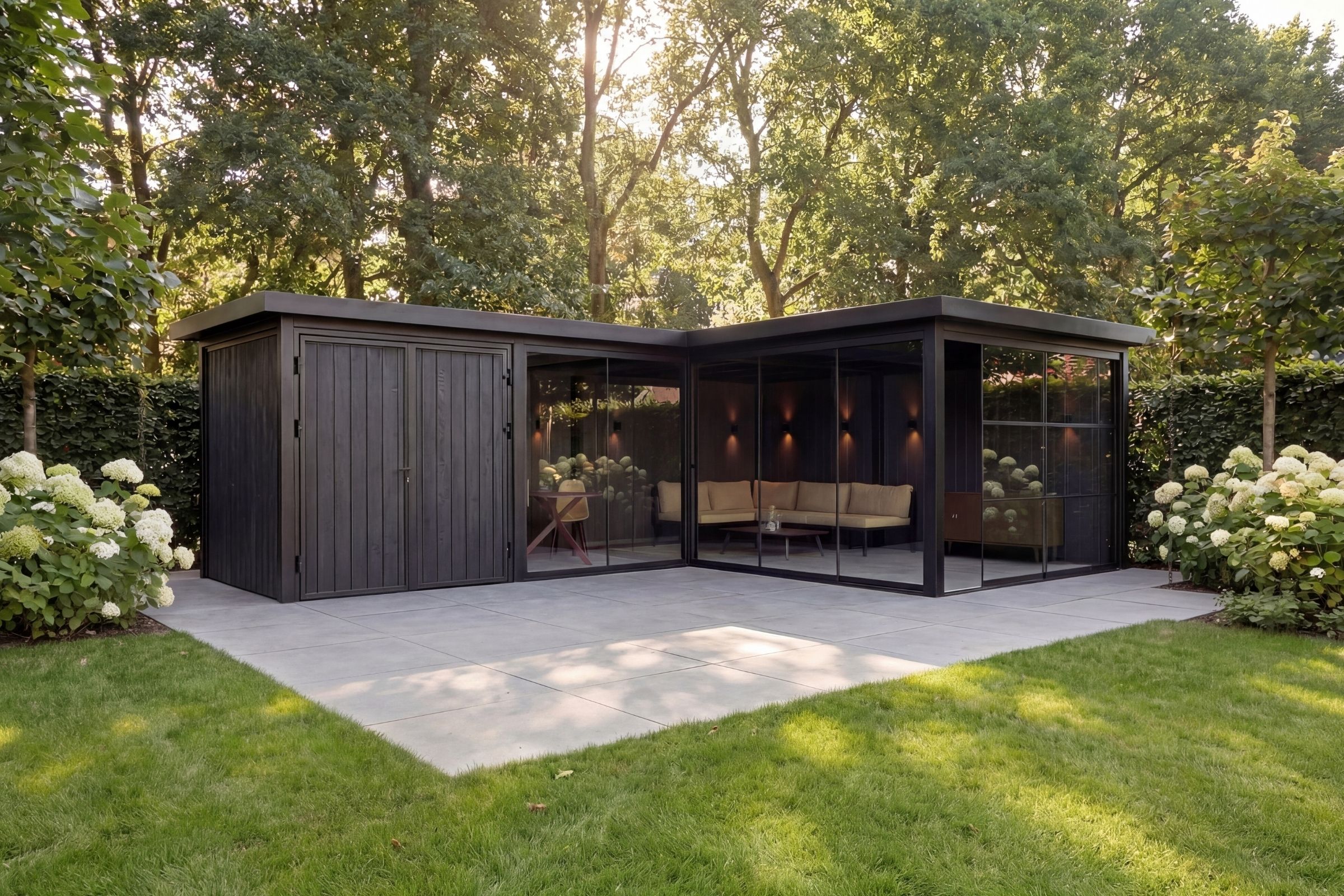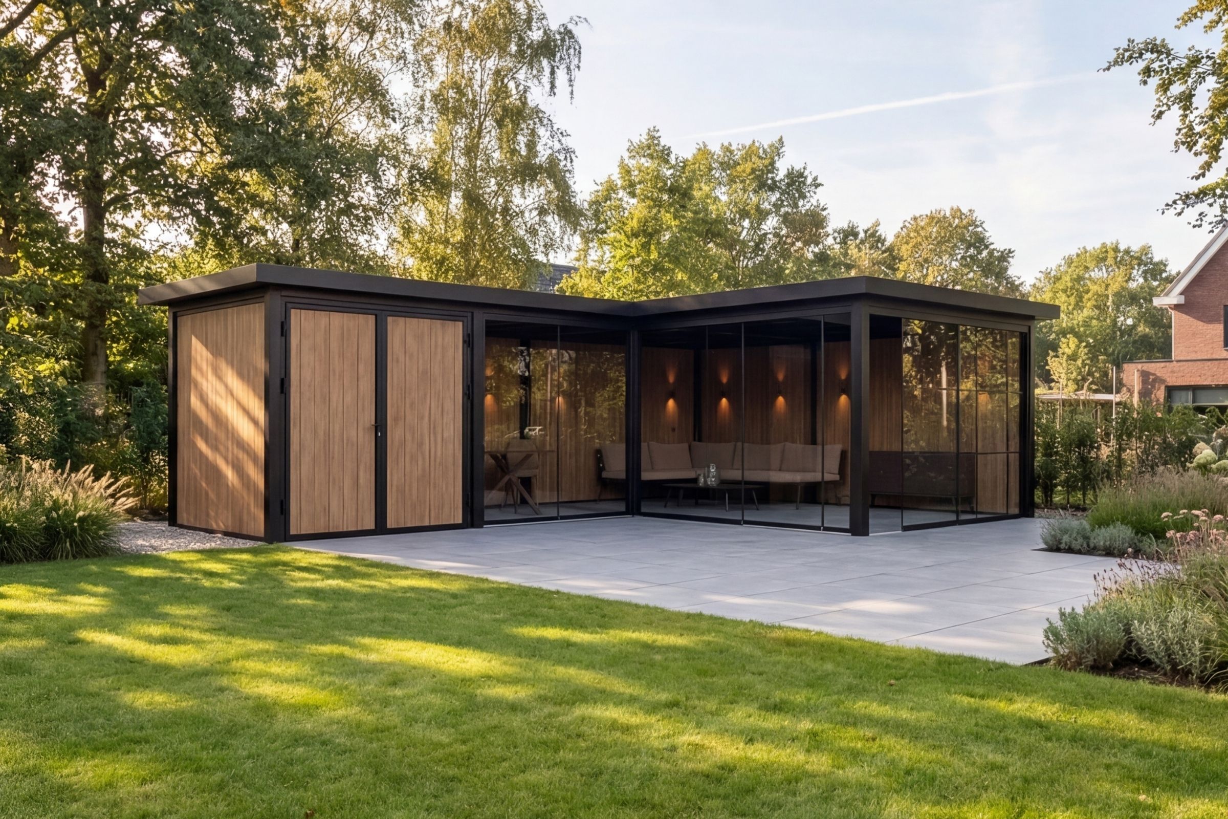 De Panorama Supreme is een stijlvolle L-vormige tuinkamer met geïntegreerde opslagruimte en brede glasfronten. Een uitgebalanceerde combinatie van vorm, functionaliteit en architectonische rust, ontworpen voor comfortabel buitenleven met een hoogwaardige uitstraling.