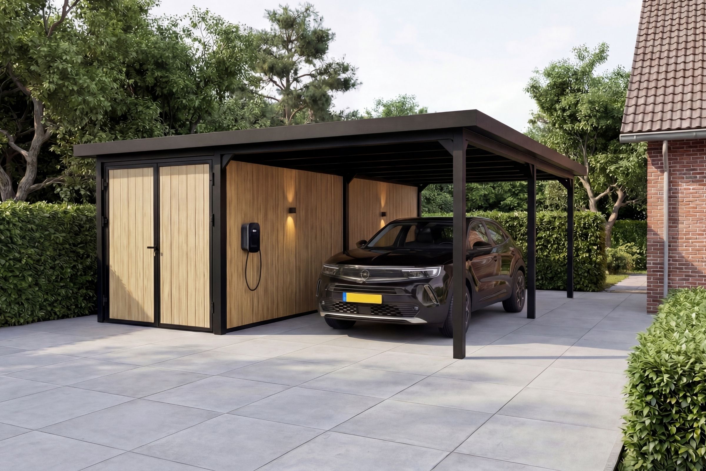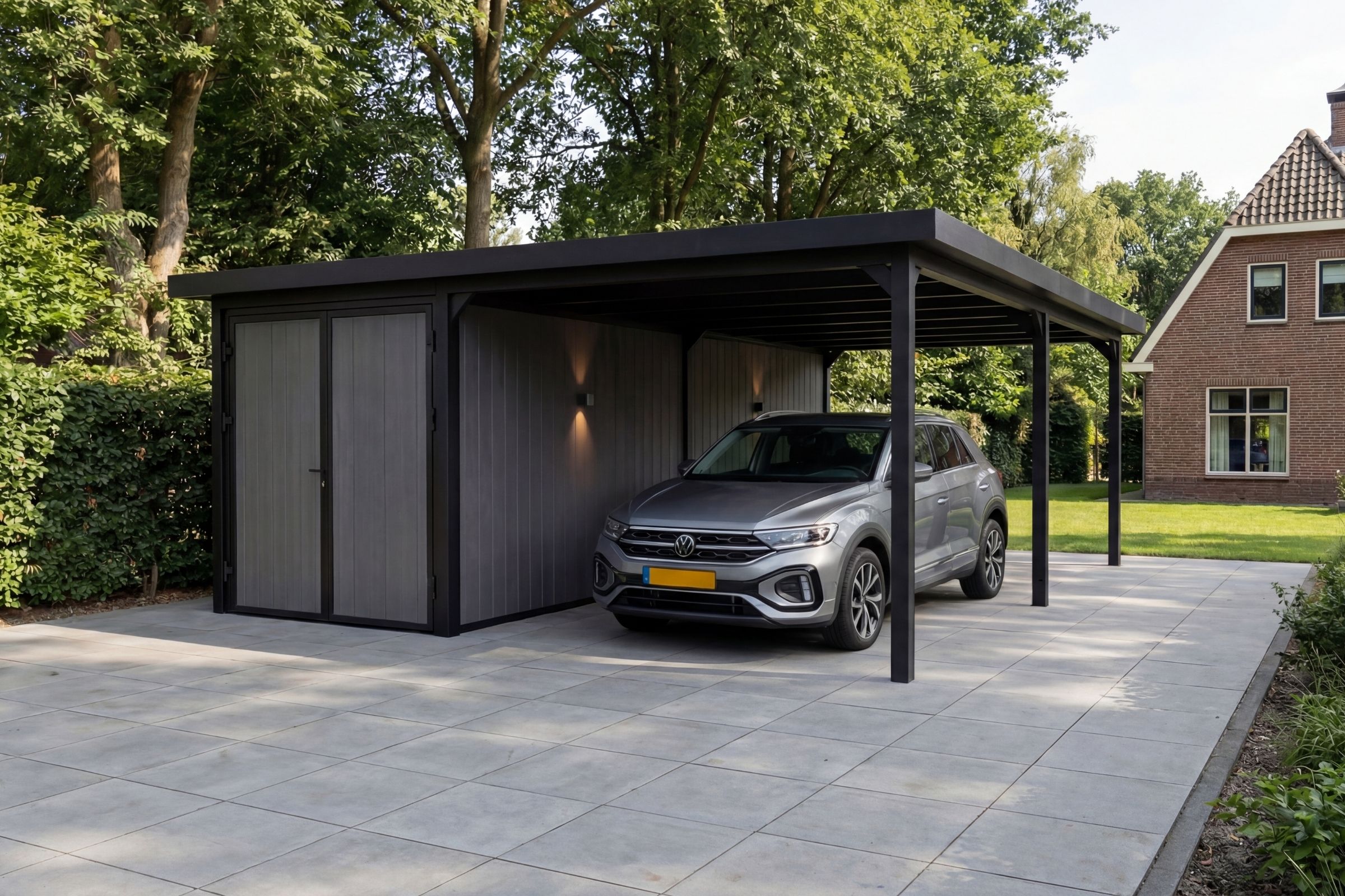Onder de overkapping ontstaat een open ruimte van 3 x 6 meter, ruim genoeg voor een auto uit het C- of D-segment, zoals een ruime middenklasse sedan of SUV. Tegelijk blijft er voldoende plaats over om comfortabel in en uit te stappen of extra spullen droog te stallen.