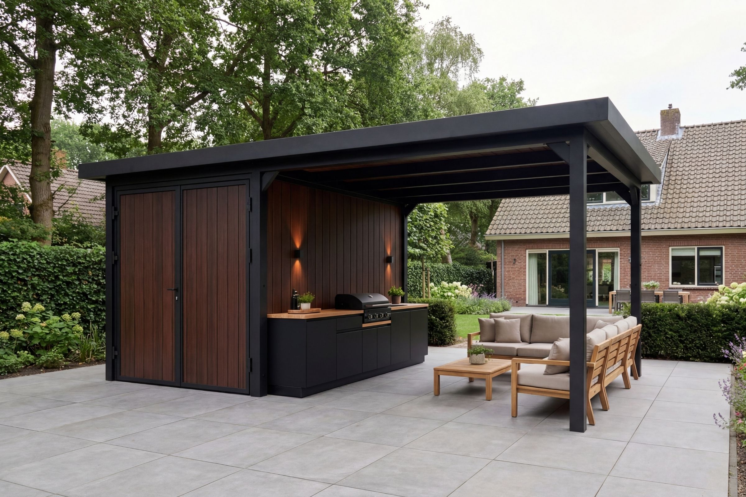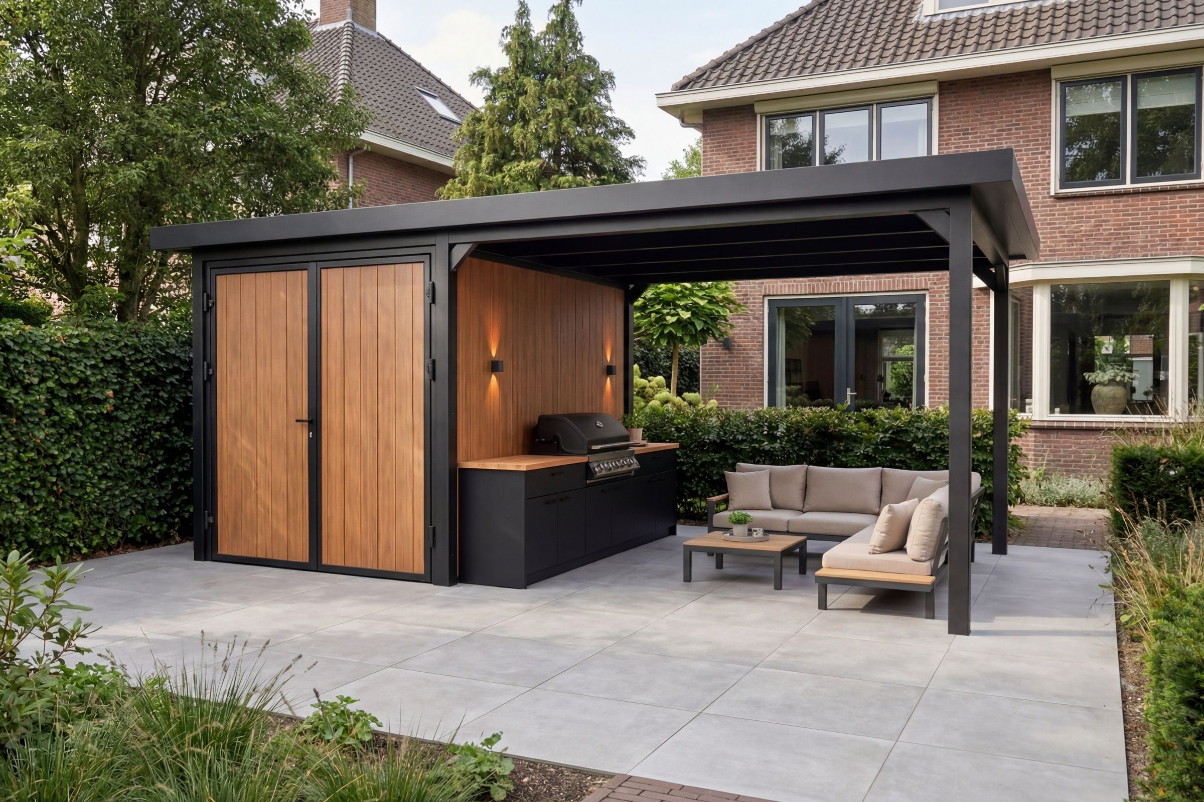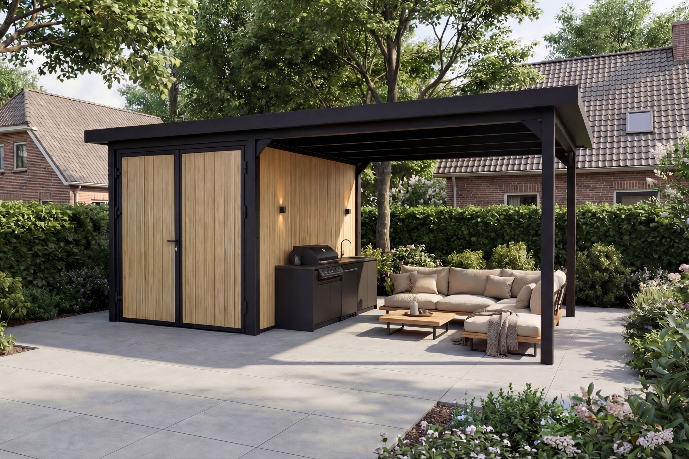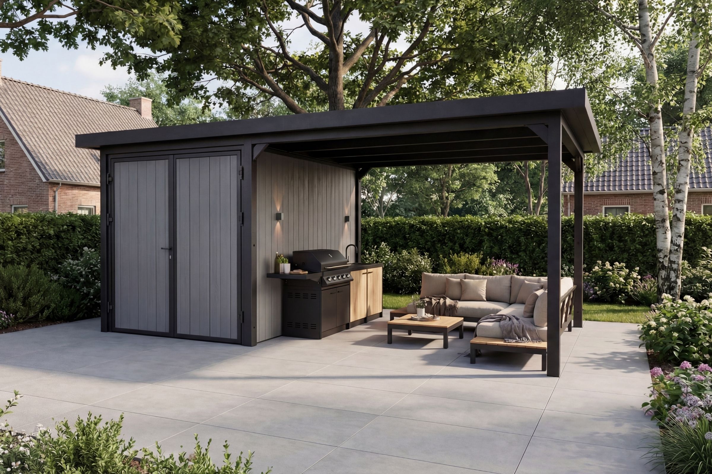 De Solara Essence is een stijlvolle overkapping met een geïntegreerde opslagruimte. Ideaal voor wie meer ruimte wenst om tuinmeubilair droog te plaatsen én tegelijk te genieten van een beschut zitgedeelte of buitenkeuken.