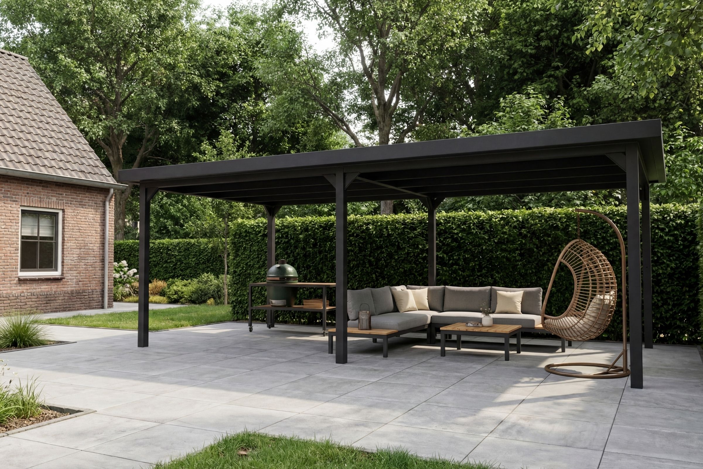Onder de overkapping ontstaat een ruime, beschutte zone waar bijvoorbeeld een middenklasse auto, een compacte auto met motor of fietsen, of een royale loungeset comfortabel geplaatst kan worden. De open zijdes zorgen ervoor dat u eenvoudig kunt manoeuvreren, terwijl het dak bescherming biedt tegen regen en zon.
